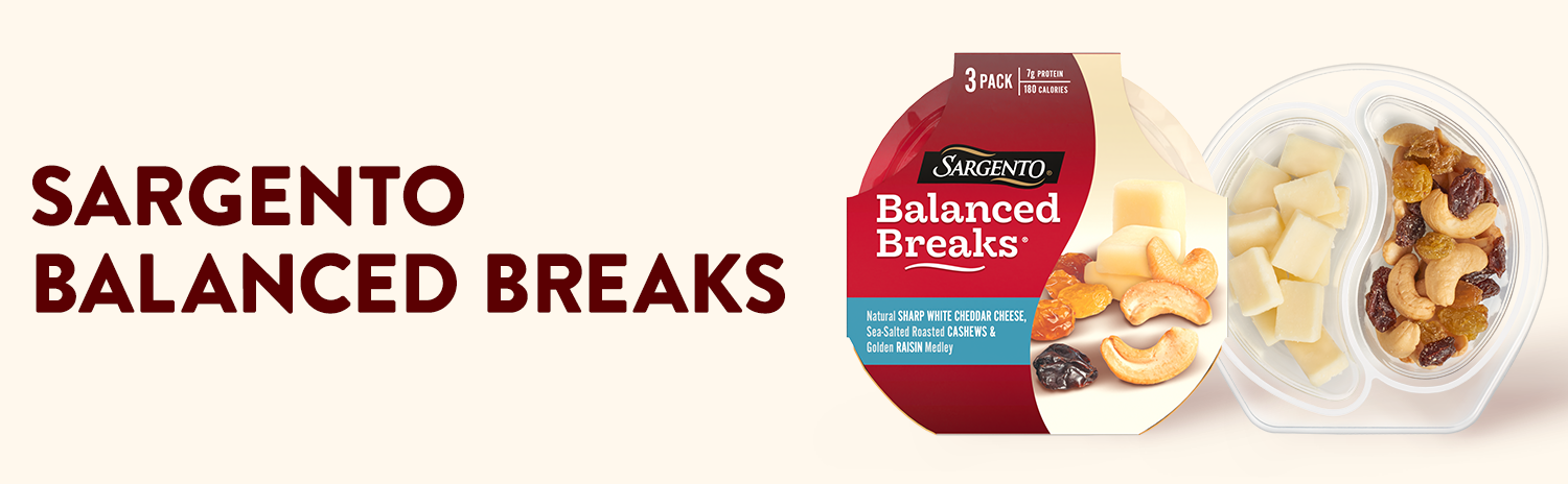 - Sargento® Balanced Breaks® snack kits combine Sharp White Cheddar Natural Cheese, dried fruit and nuts, perfect for on the go
