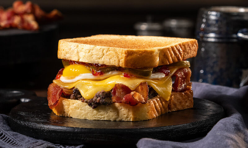 A hearty breakfast sandwich loaded with a black bean spread, bacon, aged Gouda, perfectly cooked eggs and jalapeno served on golden Texas toast.